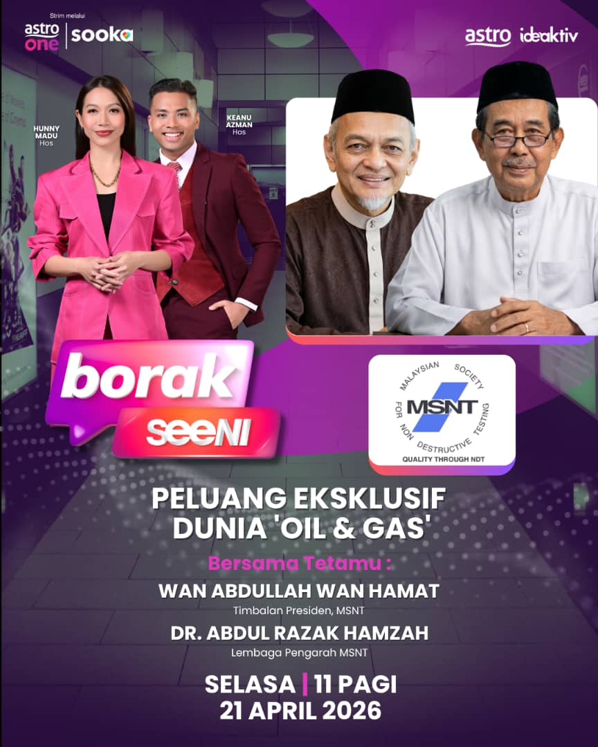 KUALA LUMPUR, 22 APRIL 2026 – The Malaysian Society for Non-Destructive Testing (MSNT) recently made a special television appearance on Astro’s popular morning talk show, Borak SeeNI, to shed light on the often-overlooked but highly critical world of Non-Destructive Testing (NDT).